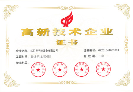 2016年11月30日,本公司之公司江門(mén)華津金屬制品有限公司(以下簡(jiǎn)稱“華津”)及江門(mén)市華睦五金有限公司(以下簡(jiǎn)稱“華睦”)分別收到由廣東省科學(xué)技術(shù)廳、廣東省財(cái)政廳、廣東省國(guó)家稅務(wù)局及廣東省地方稅務(wù)局共同批準(zhǔn)的《高新技術(shù)企業(yè)證書(shū)》(證書(shū)編號(hào)分別為:GR201644003773號(hào)及GR201644003774號(hào))。