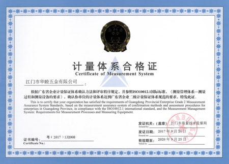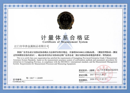 2017年9月26日,本公司之公司江門華津金屬制品有限公司(以下簡稱“華津”)及江門市華睦五金有限公司(以下簡稱“華睦”)分別通過了廣東省企業(yè)二級計量保證體系的審核,并收到由江門市質(zhì)量技術監(jiān)督局所頒發(fā)的《計量體系合格證書》(證書編號分別為:粵(2017)132009 號及粵(2017)132008 號)。